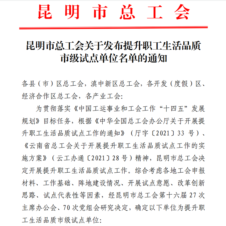 ½üÈÕ £¬À¥Ã÷ÊÐ×ܹ¤»áÐû²¼ÁË¡°ÌáÉýÖ°¹¤Éú»îÆ·ÖÊÊм¶ÊԵ㵥λ¡±Ãûµ¥ £¬Ïȷ滯¹¤¹«Ë¾ÀÖ³ÉÈëÑ¡¡£